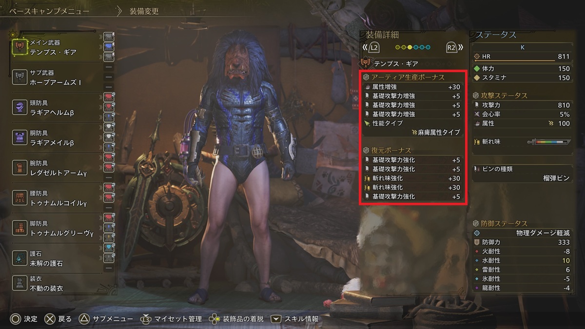 汎用では「攻撃3、斬れ味2」がベストでしょう。生産復元はビルドに応じて変えていきます。