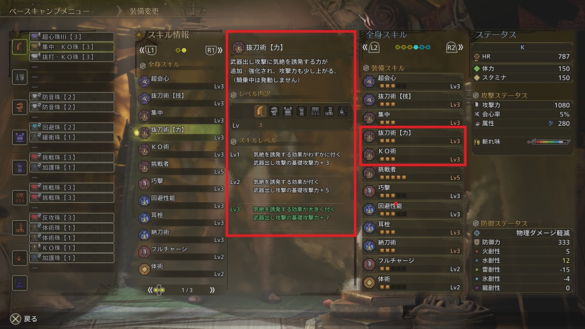 超会心5ではなく「攻撃4」の理由は、真溜めに移行できるタイミングで火力を少しでも安定させるためです。ただし、基本は超会心5です。