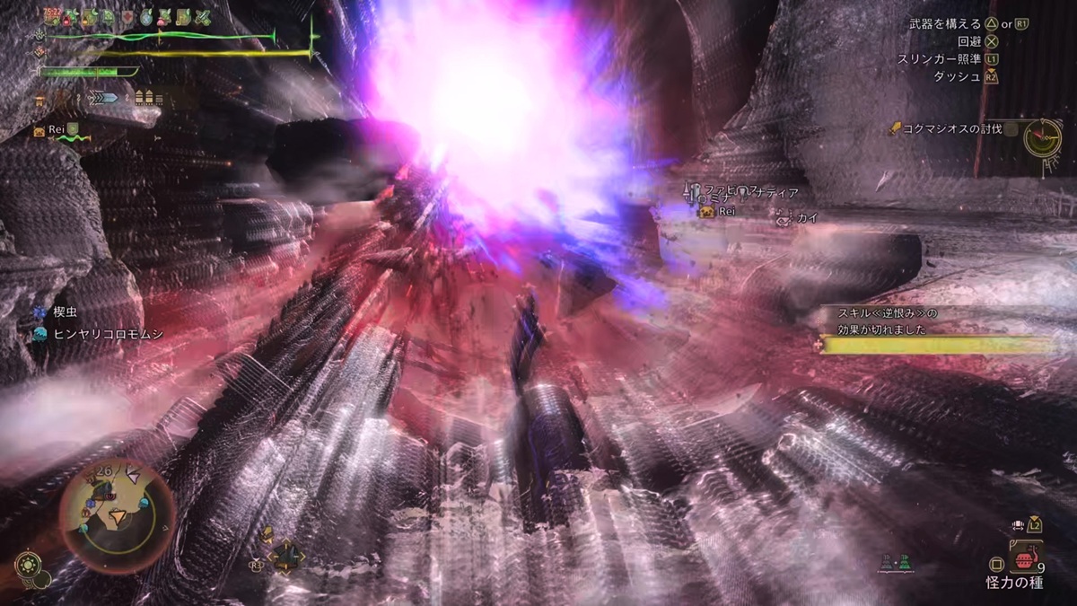 私はここから「操虫棍」に替えます。操虫棍の強みは、気化状態でも「空中乱舞」や「乗り」で対抗できることです。