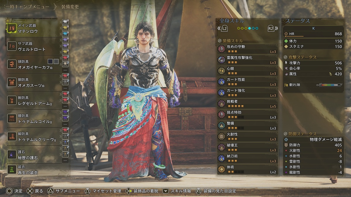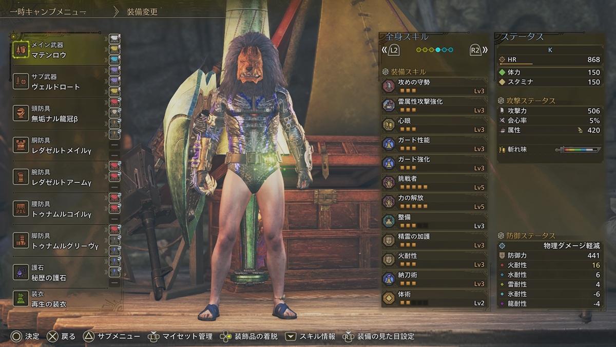 雷属性攻撃強化 攻めの守勢3、心眼3、業物3