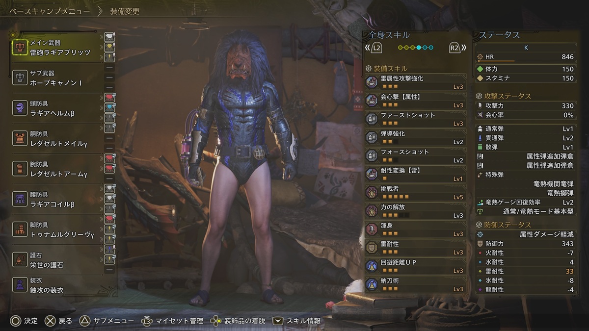 属性ライトはゴア4部位もしくは、現状(Ver.1.021)最強のラレレラトに落ち着く気がします。水属性ライトは「タマミツネ2部位」のビルドで運用しています。